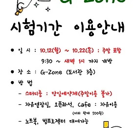 2학기 첫대출 이벤트를 시작합니다. 더보기 G-Zone 시험기간 이용 안내 진행중인 이벤트는 여기에서 보세요. 더보기 2015년 제4회 독후감공모전 실시 2015년 제4회 도서관 추천도서 독후감공모전 추천도서 읽고 독후감 쓰면 100만원이 내 손안에!! - 대상도서 : 도서관 추천 도서 중 최근 3년간 선정한 도서 (2012년 3월 ~ 2015년 10월 선정도서) - 독후감은 A4용지 2매 내외로 작성 - 제출기한 : 2015년 10월 30일 까지 - 제출방법 : ·참가신청서와 작성한 독후감을 온·오프라인 동시제출 (e-메일:ebebe@gtec.ac.kr, 오프라인:도서관 1층 종합자료실) 상금 대상 1명 x 100만원 상당의 상금 금상 2명 x 50만원 상당의 상금 은상 3명 x 30만원 상당의 상금 동상 5명 x 10만원 상당의 상금 장려상 10명 x 5만원 상당의 상금 자세한 내용을 보려면 여기를 클릭!! 함께하는 이벤트 '우수이용자 선발'도 아래에.. 더보기 이전 1 ··· 29 30 31 32 33 34 35 ··· 71 다음