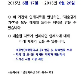 2015년 도서관 우수이용자 선발 2015년 우수이용자 선발 1년동안 책만 열심히봐도 상금이 내 품안에 (1) 도서대출 부문 우수이용자 선발 - 〔도서관리 프로그램 대출기록 기준으로 선정〕 - 도서대출 횟수 일정량 이상인 이용자만 산출 - 연체기간이 30일 이상 또는 심사기간 현재 연체중인 이용자 제외 (2) 국내 전자책 부문 우수이용자 선발 - 〔전자책 홈페이지 관리자 통계 자료를 기준으로 선정〕 - 대출책수가 가장 많은 이용자부터 순위 선정 도서 부문 금상 1명 x 50만원 상당의 상금 은상 4명 x 40만원 상당의 상금 동상 14명 x 10만원 상당의 상금 전자책 부문 금상 1명 x 20만원 상당의 상금 은상 3명 x 10만원 상당의 상금 동상 5명 x 5만원 상당의 상금 자세한 내용은 여기 에서 확인!! 더보기 연체된 자료는 지금 반납하세요. 더보기 잡지 무료 배포 이벤트 실시 안내 더보기 이전 1 ··· 30 31 32 33 34 35 36 ··· 71 다음