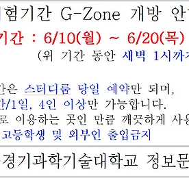G-Zone(학습·휴식)이용 안내 G-Zone 이용안내 □ G-Zone : 쾌적한 학습·휴식 공간 + Cafe □ 위 치 : 정보문화관(도서관) 3층 □ 이용시간 : 9:30 - 22:00 (학기중) □ 이용방법 - 스터디룸 : 이용 전 반드시 예약 (당일 현장 접수 가능) ‣ 아지트(소규모 7실), 하모니(대규모 4실) - 자유열람실, 카페 : 자유롭게 이용 가능 ※ 무선인터넷 사용 가능 / 노트북․빔프로젝트․스크린 대여 가능 / 커피 판매(500원) □ 이용 문의 : 031-496-4635 ※ 스터디룸 일일 예약현황은 '도서관홈페이지→알림판→자료실'에서 확인 가능합니다. 더보기 시험기간 G-Zone 개방 안내 더보기 보물찾기 이벤트 ☆ 보물찾기 이벤트 ☆ 도서관 책 속에 숨겨놓은 보물(상품 교환쿠폰) 찾기! 가. 일 정 : 매달 첫번째 수요일 (4/3, 5/1, 6/5) 나. 참여방법 ① 보물을 숨겨놓은 책과 관련된 힌트 확인 (정보문화관(도서관) 1층 로비) ② 종합자료실에서 해당 책을 검색하여 대출처리 후 보물 확인 ③ 보물(쿠폰)을 제출하는 학생에게 상품 증정(선착순) 다. 선발인원 및 상품 선착순 인 원 상 품 1~3등 3명 문화상품권 2만원권 4~10등 7명 문화상품권 1만원권 더보기 이전 1 ··· 44 45 46 47 48 49 50 ··· 71 다음
